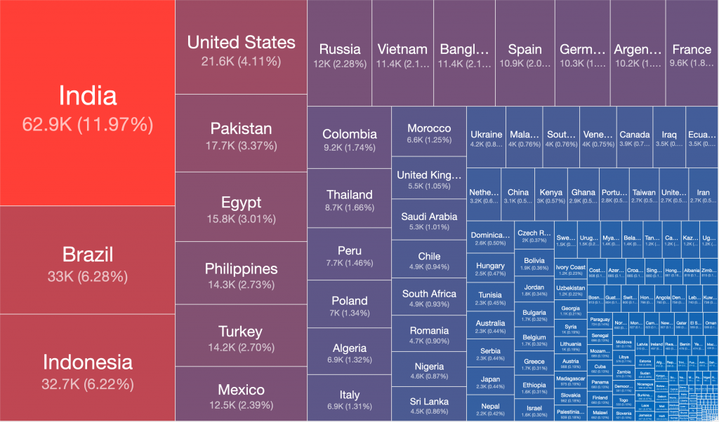Looking at the data in a different way, the tree map below shows the relative ratio of Rhadamanthys infections logged per country to the total. Note that a small number (14) of IP addresses do not geolocate to a country, so the displayed number is slightly lower than the actual total: