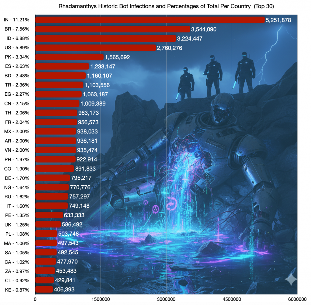 The data shared in our first Rhadamanthys Historical Bot Infections Special Report covers malware infections from the period from 2025-03-14 to 2025-11-11. We are publicly sharing some initial high level analysis of this Rhadamanthys historical bot infections dataset. The first dataset represents 86,214,924 different information stealing events recorded on victim computers, corresponding to 525,303 unique IP addresses located in 17,674 different Autonomous Systems (ASNs), across 226 different countries (so essentially the entire world). For each of the images below you can click on it to view a higher resolution version.