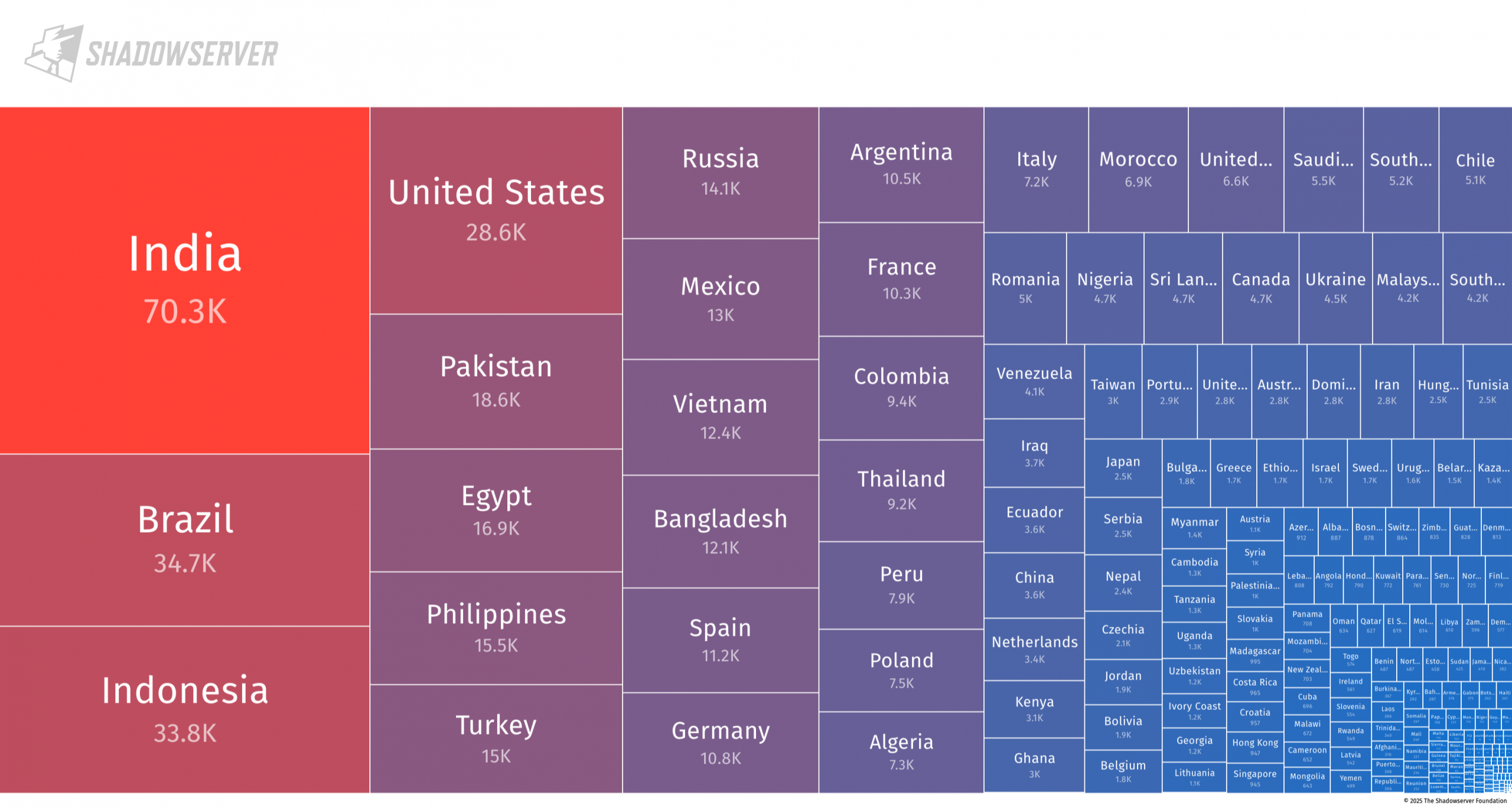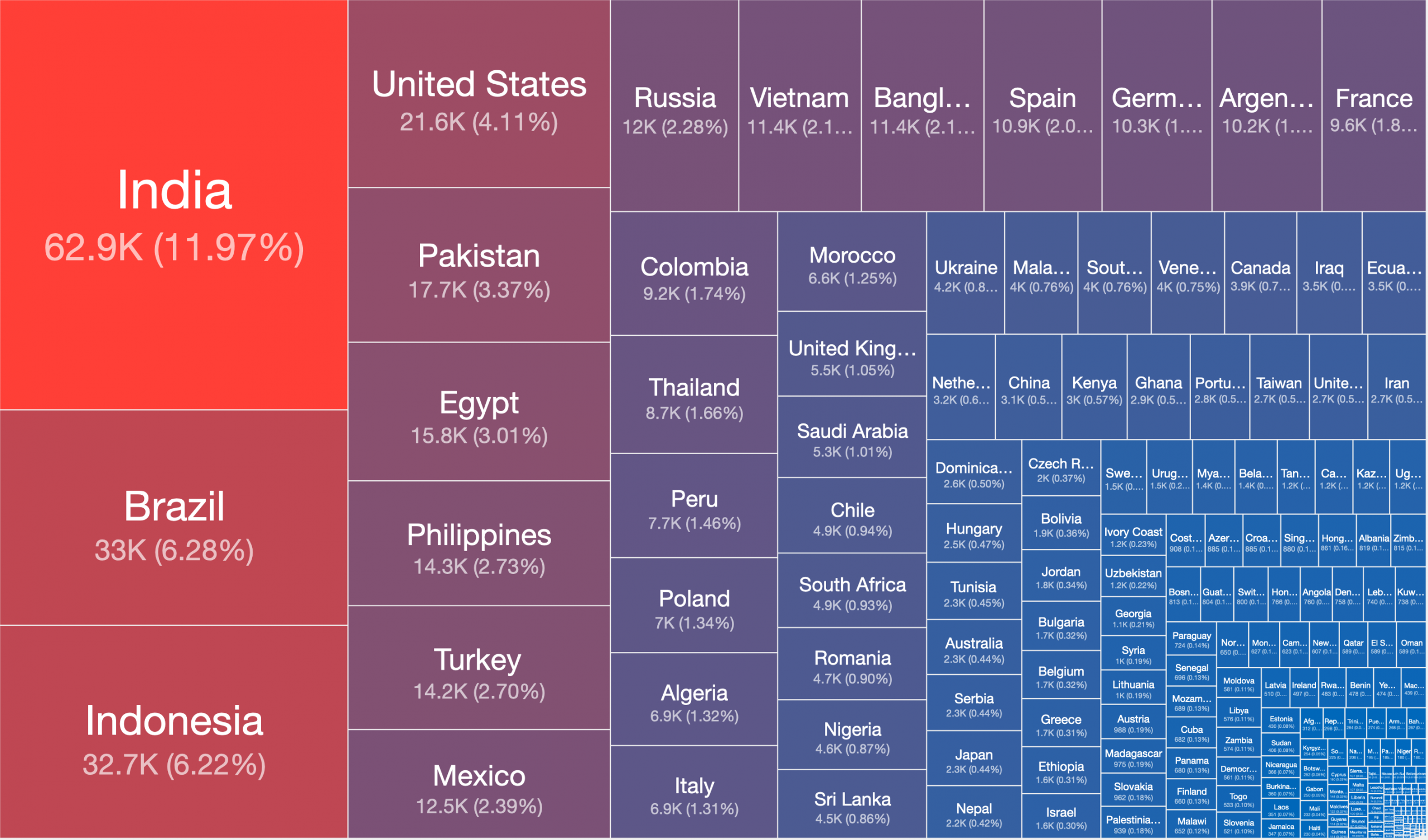 Looking at the data in a different way, the tree map below shows the relative ratio of Rhadamanthys infections logged per country to the total. Note that a small number (14) of IP addresses do not geolocate to a country, so the displayed number is slightly lower than the actual total: