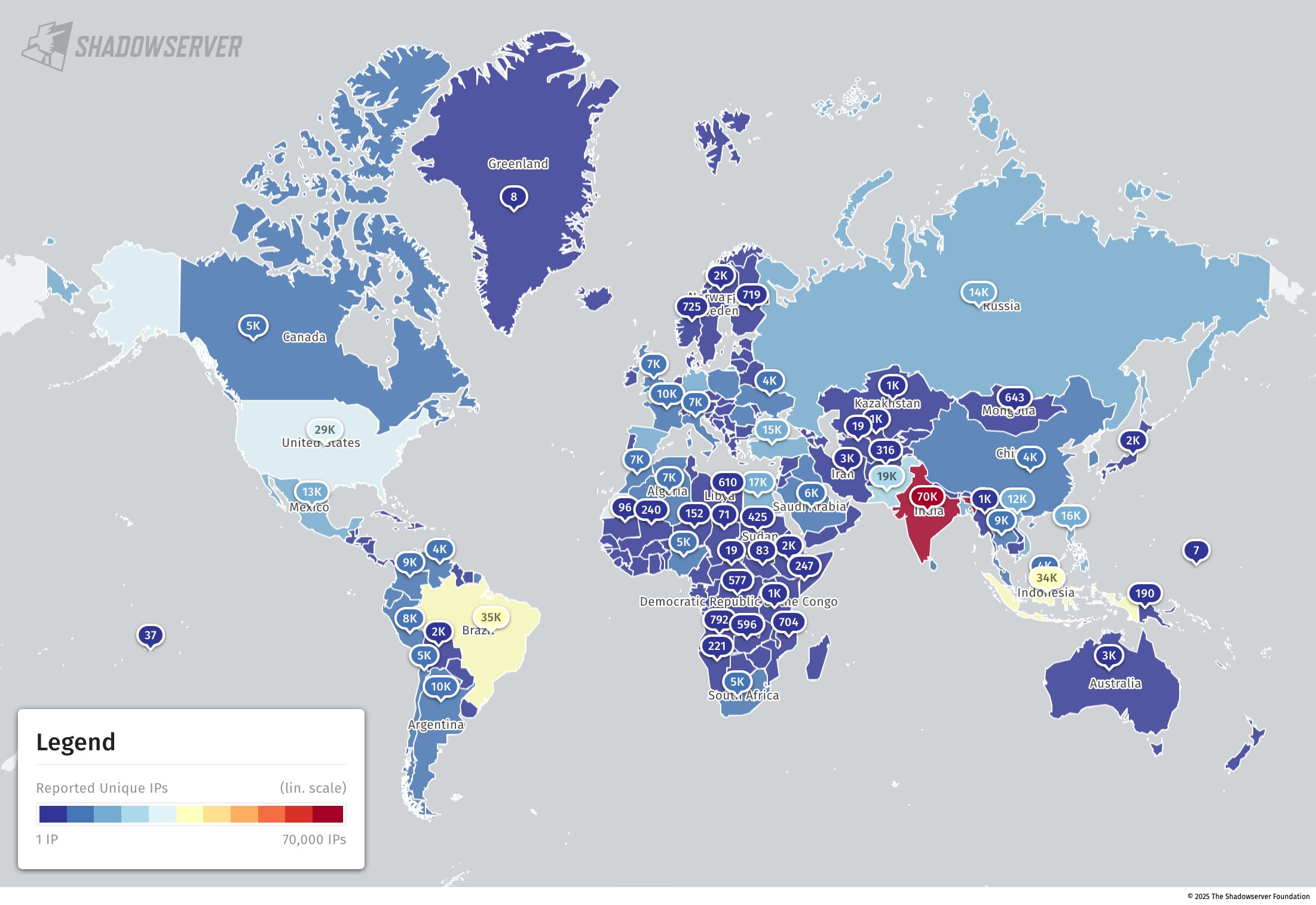 The IP-geolocated locations of each logged Rhadamanthys infection (note that since there can be multiple bot infections behind a single IP address, these visualizations show unique geolocated IP addresses and may therefore under-represent the actual victim distribution globally):