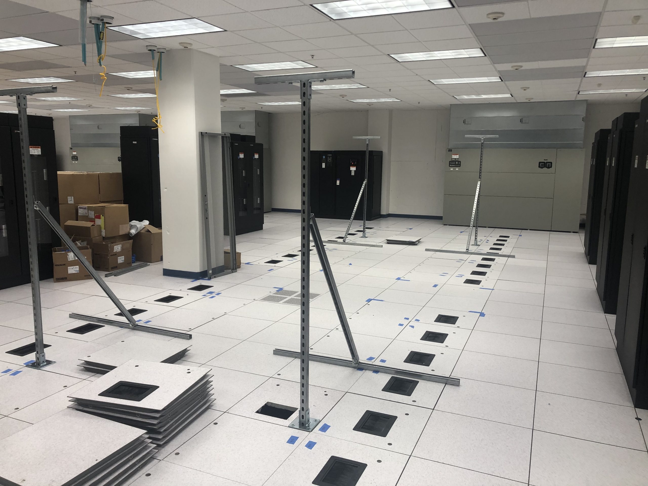 The planned fiber and ladder trays will be mounted on top of all the racks once they arrive, but to get the trays installed now they had to put in vertical braces to hold it up until the racks arrived: